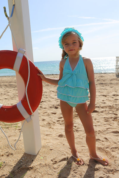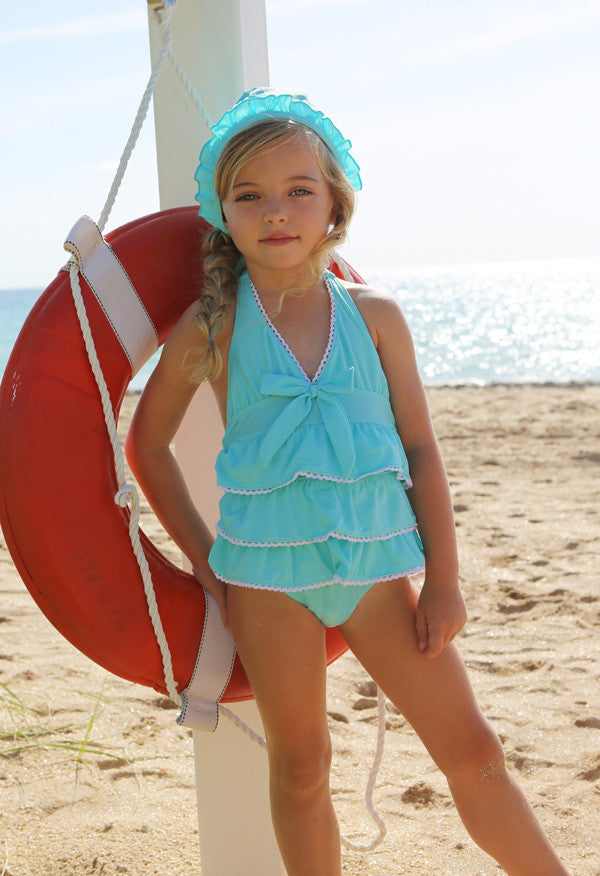 Anna Swimsuit is aqua ruffles with white edge detailing. Made with 80% nylon, 20% spandex. All materials are suitable for swimming. Comes with matching bonnet.